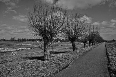 n de stilte van het polderlandschap loop ik met mijn hond. Prachtige Hollandse grijze wolkenpartijen trekken voorbij. Een reiger staat aan de oever te